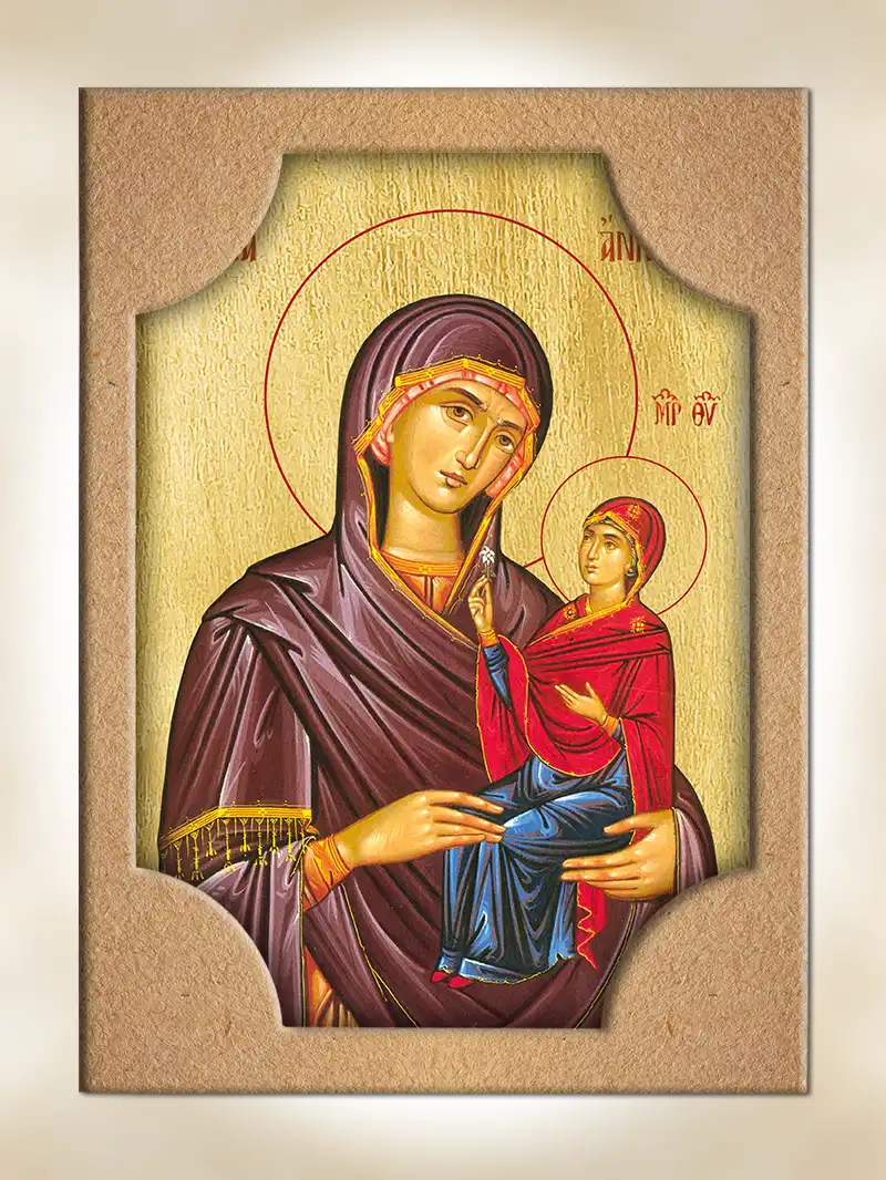 H εικόνα είναι από mdf 16 mm. Η μπροστινή όψη ειναι χρυσωμένη με φύλλο χρυσού και αποτυπώνεται η Αγία Άννα. Η πίσω όψη του ξύλου και το φιλέτο είναι λουστραρισμένα και βαμμένα με ανεξίτηλο χρώμα σε κόκκινη απόχρωση. Συσκευασία σε χάρτινο κουτί. Μπορεί να κρεμαστεί επιτοίχια ή να σταθεί επιτραπέζια με επιπρόσθετη βάση. (Κωδ. 0-02-941-7349)