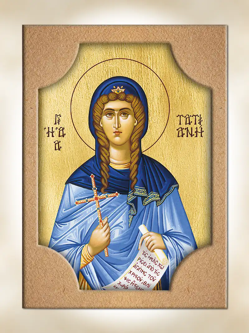 H εικόνα είναι από mdf 16 mm. Η μπροστινή όψη ειναι χρυσωμένη με φύλλο χρυσού και αποτυπώνεται η Αγία Τατιάνα. Η πίσω όψη του ξύλου και το φιλέτο είναι λουστραρισμένα και βαμμένα με ανεξίτηλο χρώμα σε κόκκινη απόχρωση. Συσκευασία σε χάρτινο κουτί. Μπορεί να κρεμαστεί επιτοίχια ή να σταθεί επιτραπέζια με επιπρόσθετη βάση. (Κωδ. 0-02-941-8093)