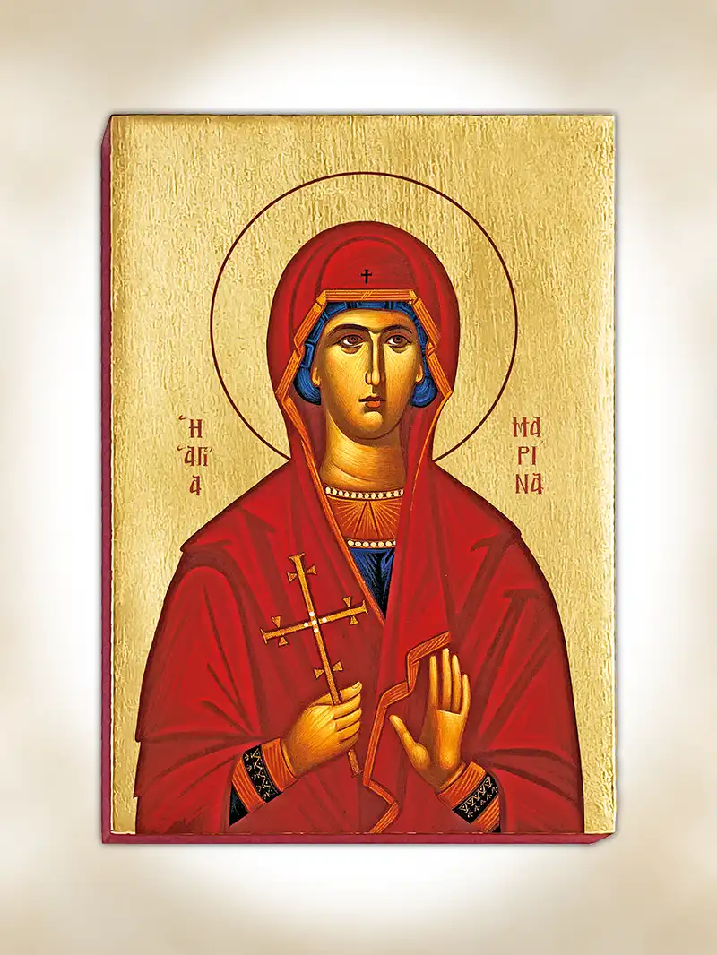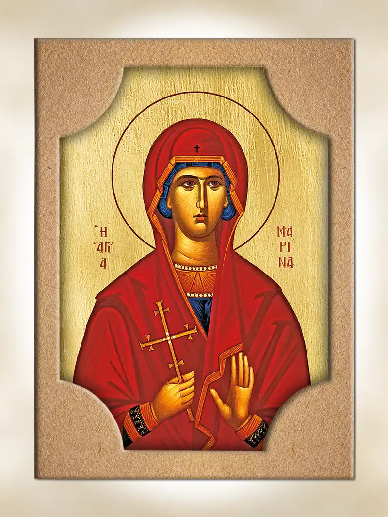 H εικόνα είναι από mdf 16 mm. Η μπροστινή όψη ειναι χρυσωμένη με φύλλο χρυσού και αποτυπώνεται η Αγία Μαρίνα. Η πίσω όψη του ξύλου και το φιλέτο είναι λουστραρισμένα και βαμμένα με ανεξίτηλο χρώμα σε κόκκινη απόχρωση. Συσκευασία σε χάρτινο κουτί. Μπορεί να κρεμαστεί επιτοίχια ή να σταθεί επιτραπέζια με επιπρόσθετη βάση. (Κωδ. 0-02-941-8136)