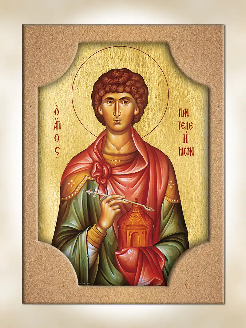 H εικόνα είναι από mdf 16 mm. Η μπροστινή όψη ειναι χρυσωμένη με φύλλο χρυσού και αποτυπώνεται ο Άγιος Παντελεήμων. Η πίσω όψη του ξύλου και το φιλέτο είναι λουστραρισμένα και βαμμένα με ανεξίτηλο χρώμα σε κόκκινη απόχρωση. Συσκευασία σε χάρτινο κουτί. Μπορεί να κρεμαστεί επιτοίχια ή να σταθεί επιτραπέζια με επιπρόσθετη βάση. (Κωδ. 0-02-941-8416)