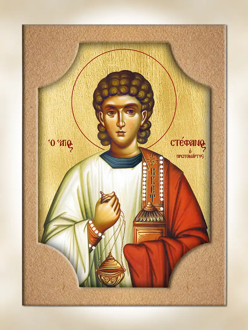 H εικόνα είναι από mdf 16 mm. Η μπροστινή όψη ειναι χρυσωμένη με φύλλο χρυσού και αποτυπώνεται ο Άγιος Στέφανος. Η πίσω όψη του ξύλου και το φιλέτο είναι λουστραρισμένα και βαμμένα με ανεξίτηλο χρώμα σε κόκκινη απόχρωση. Συσκευασία σε χάρτινο κουτί. Μπορεί να κρεμαστεί επιτοίχια ή να σταθεί επιτραπέζια με επιπρόσθετη βάση. (Κωδ. 0-02-941-8616)