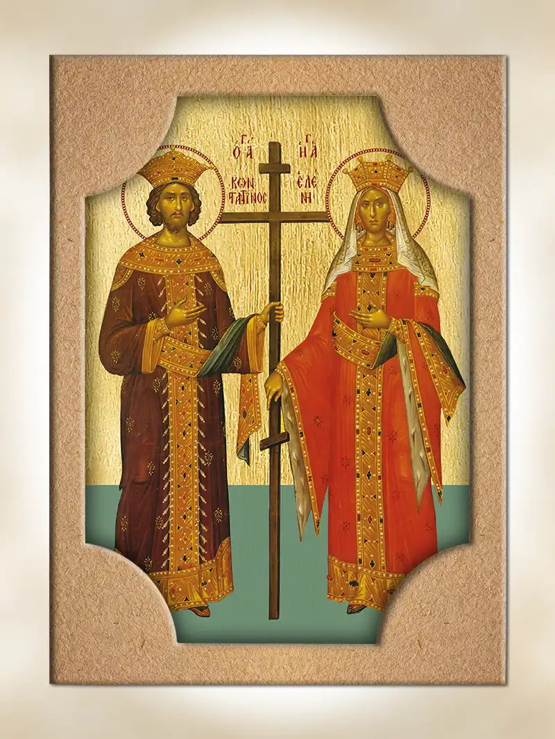 H εικόνα είναι από mdf 16 mm. Η μπροστινή όψη ειναι χρυσωμένη με φύλλο χρυσού και αποτυπώνονταιι ο Άγιος Κων/νος και η Αγία Ελένη. Η πίσω όψη του ξύλου και το φιλέτο είναι λουστραρισμένα και βαμμένα με ανεξίτηλο χρώμα σε κόκκινη απόχρωση. Συσκευασία σε χάρτινο κουτί. Μπορεί να κρεμαστεί επιτοίχια ή να σταθεί επιτραπέζια με επιπρόσθετη βάση. (Κωδ. 0-02-941-8969)