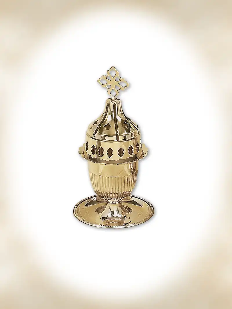 Επιτραπέζιο μπρούτζινο λείο οικιακό καντήλι με πιατάκι. Αμπαλάζ σε διάφανη συσκευασία δώρου. Ύψος: 20 cm. (Κωδ. 0-VL-4301)